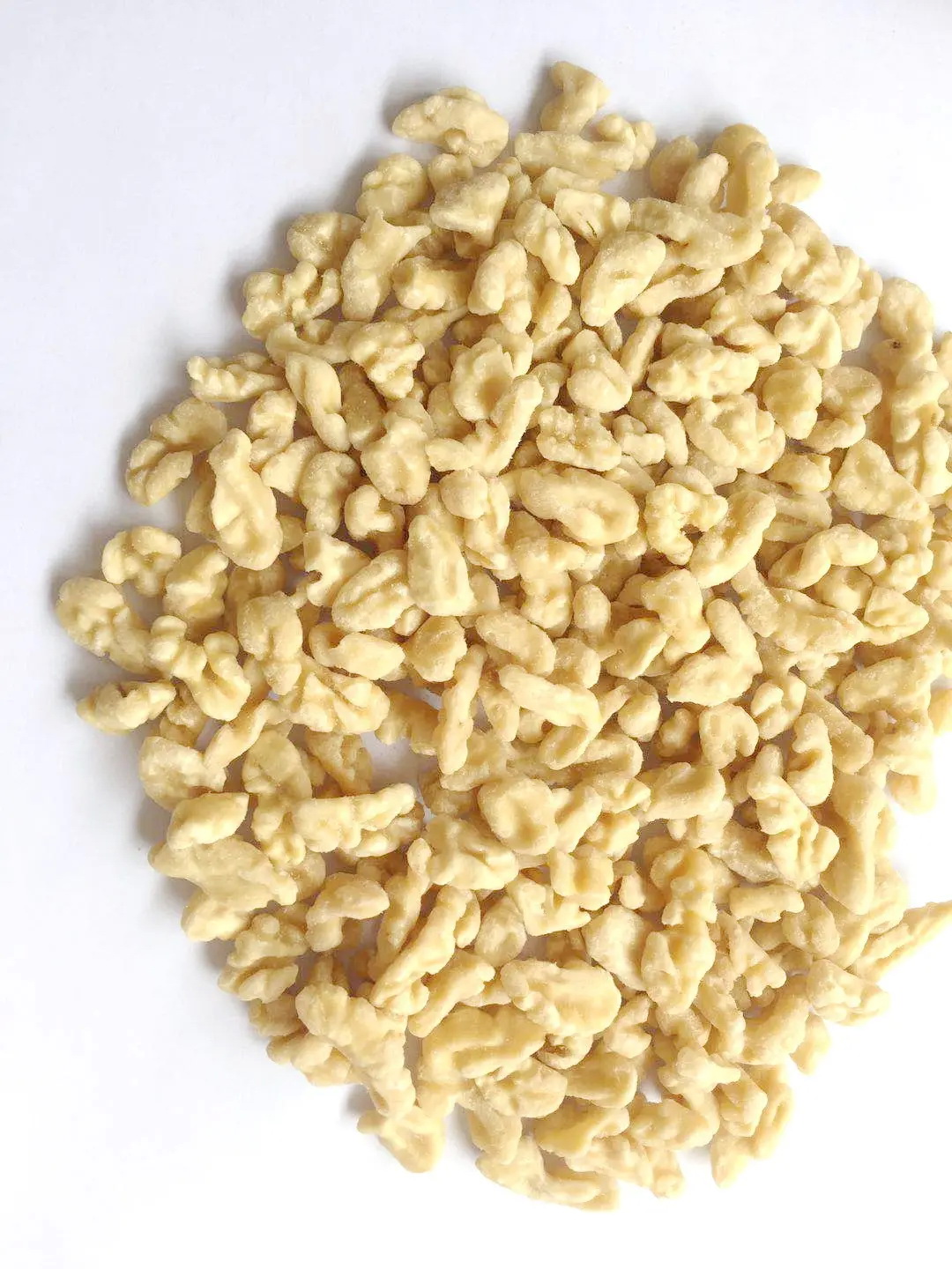 纯手工去皮法是不经任何辅助,人工手剥去内种皮。此法去皮干净,损失率少,营养保持好。但由于内种皮紧紧覆盖着整个核桃仁,且核桃仁呈皱褶,沟回满布,人工去皮难度大,耗时较长,效率较低 ,对鲜核桃仁可行,一般在生产规模不大或机械设备较差时使用。